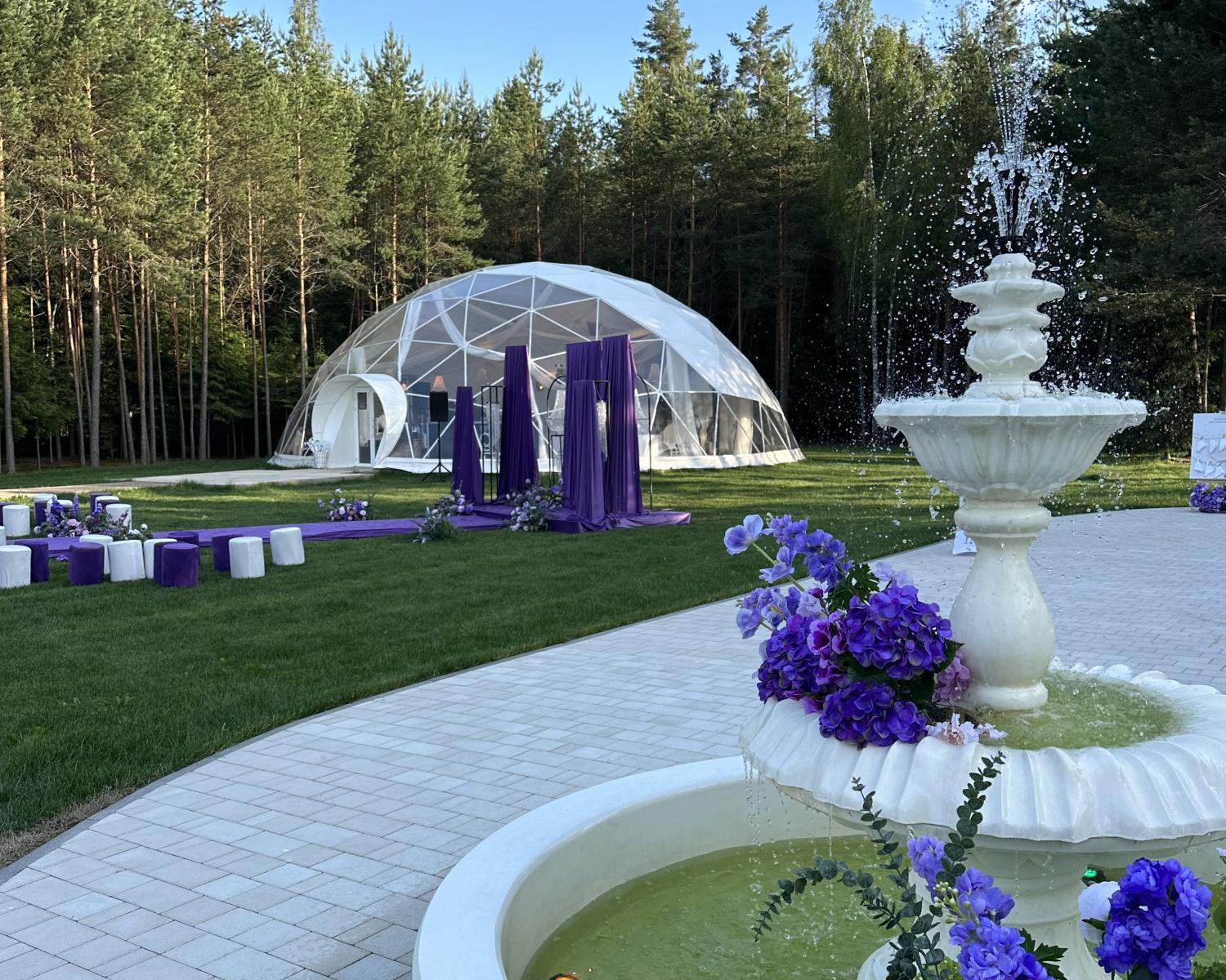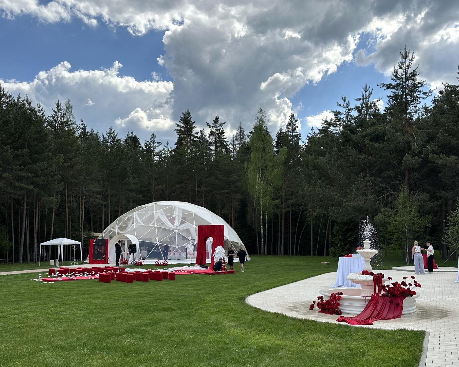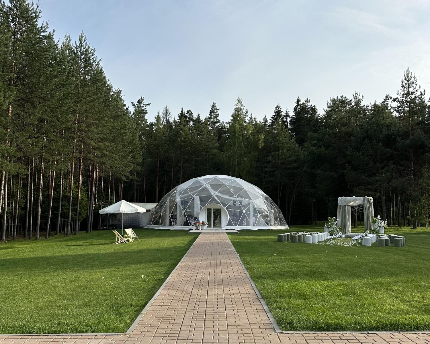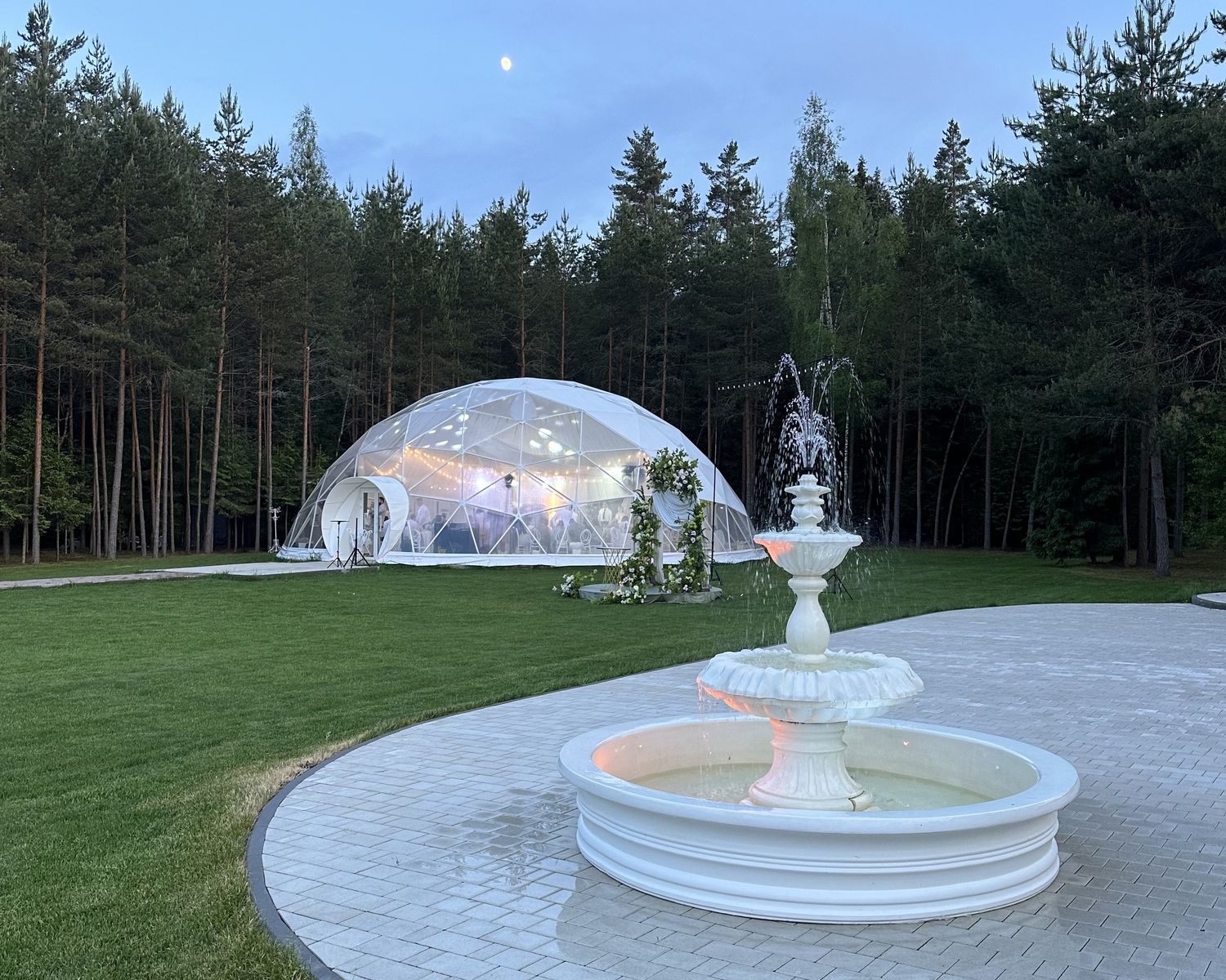 Банкетный зал для свадьбы расположен за городом, на свежем воздухе. «Сфера» - это дизайнерский просторный зал с крышей в форме купола сферы, площадь которого составляет 250 кв.м.