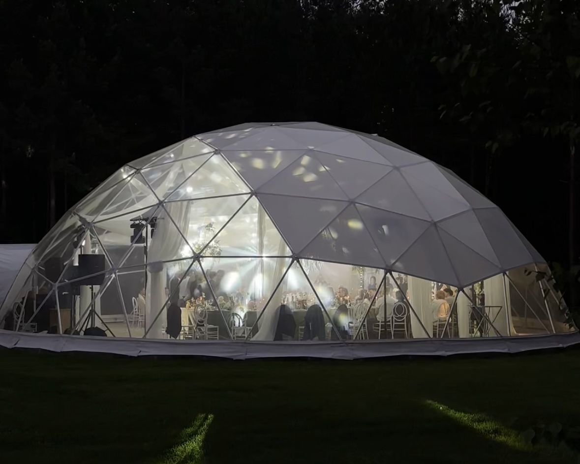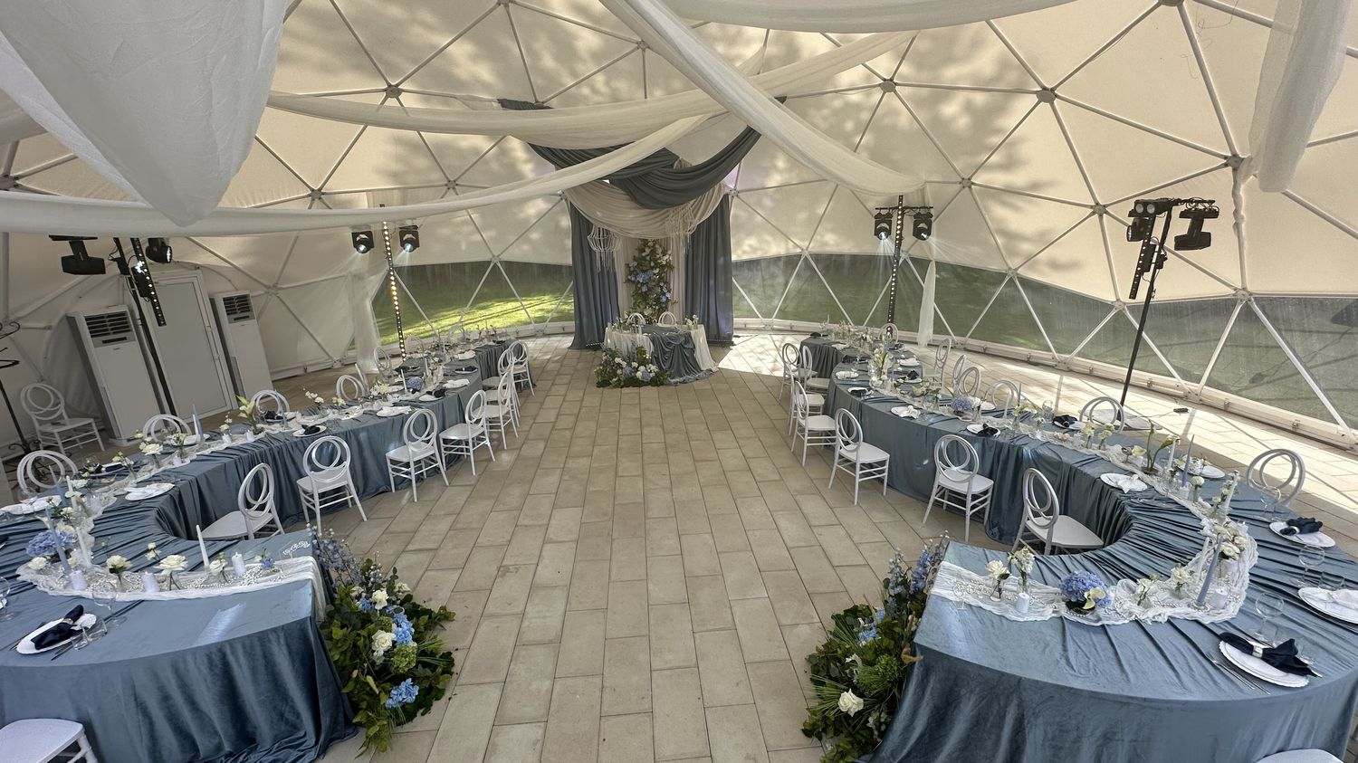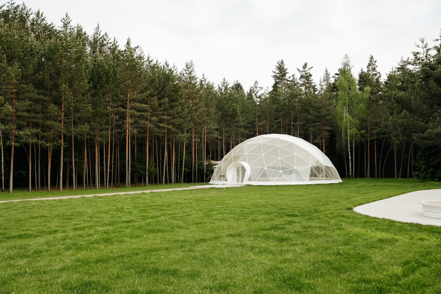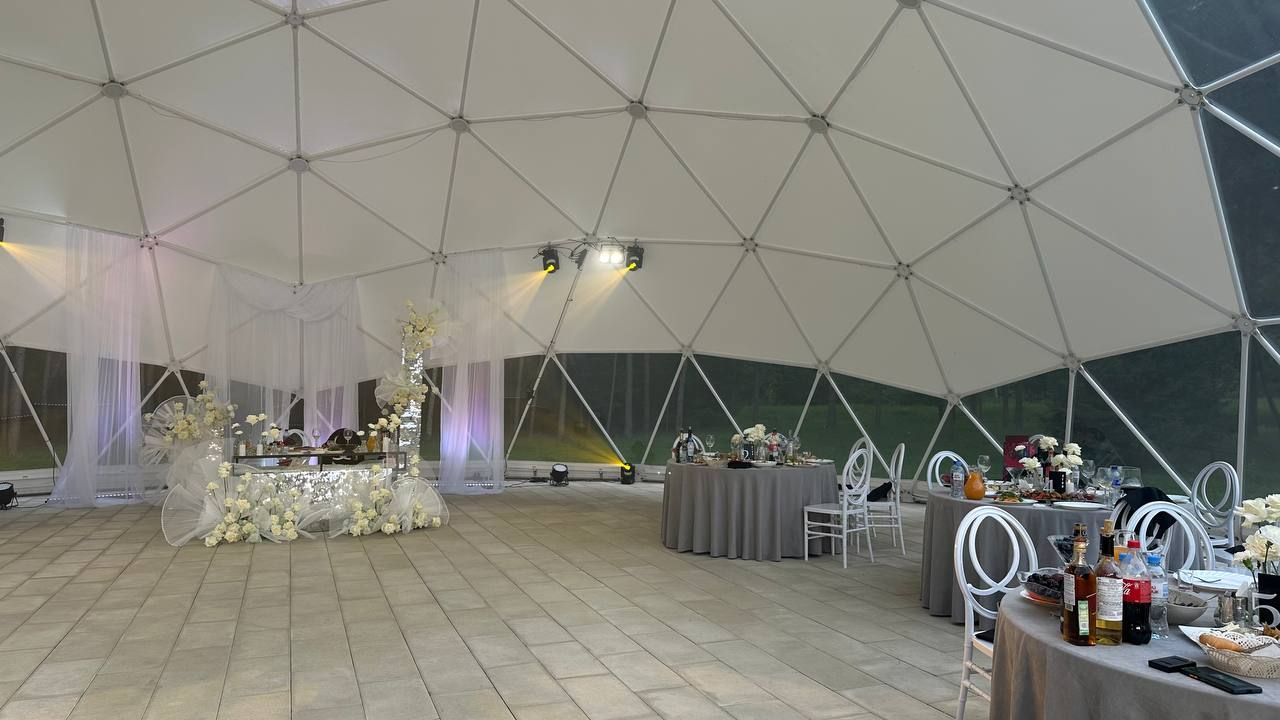 Банкетный зал для свадьбы расположен за городом, на свежем воздухе. «Сфера» - это дизайнерский просторный зал с крышей в форме купола сферы, площадь которого составляет 250 кв.м.