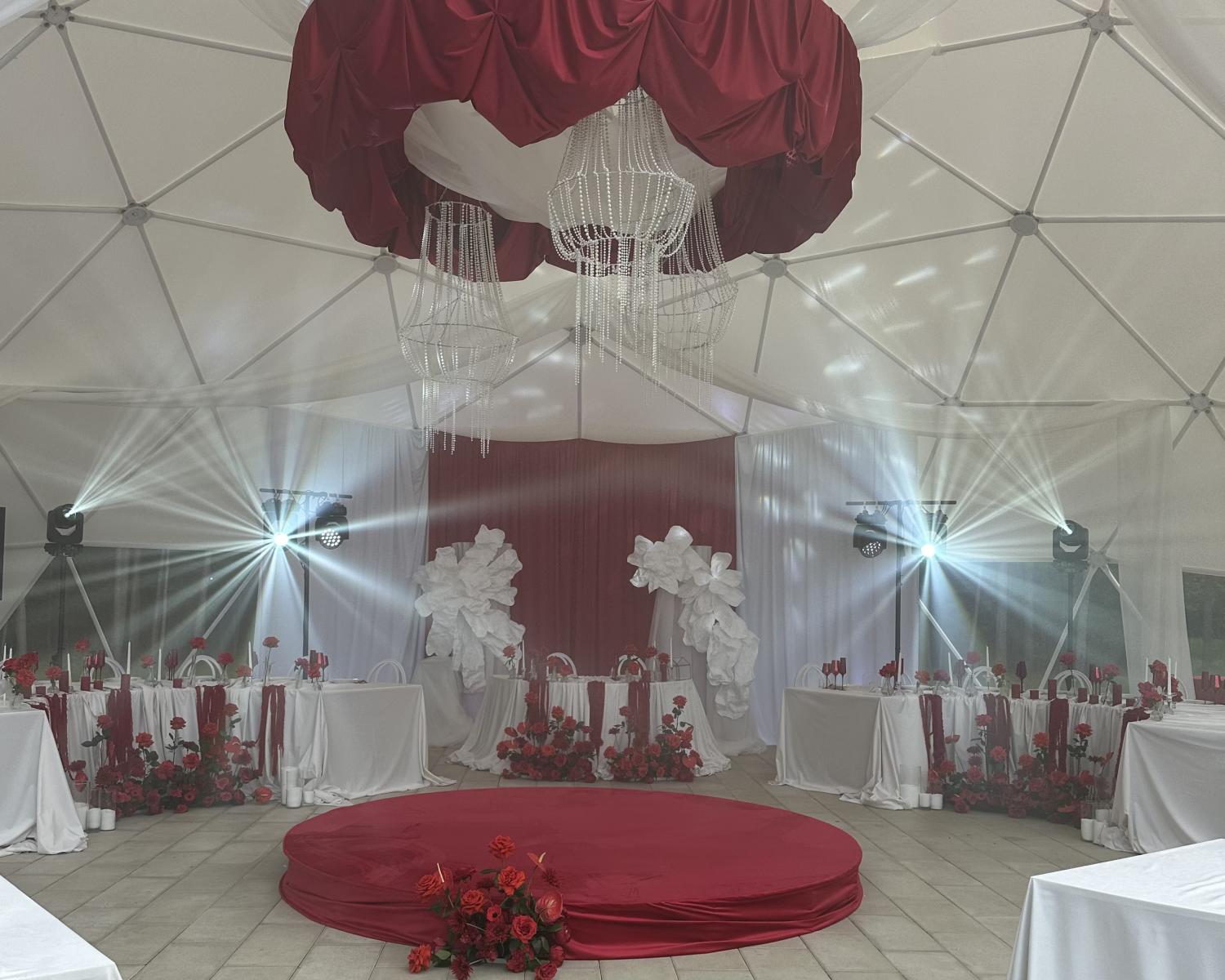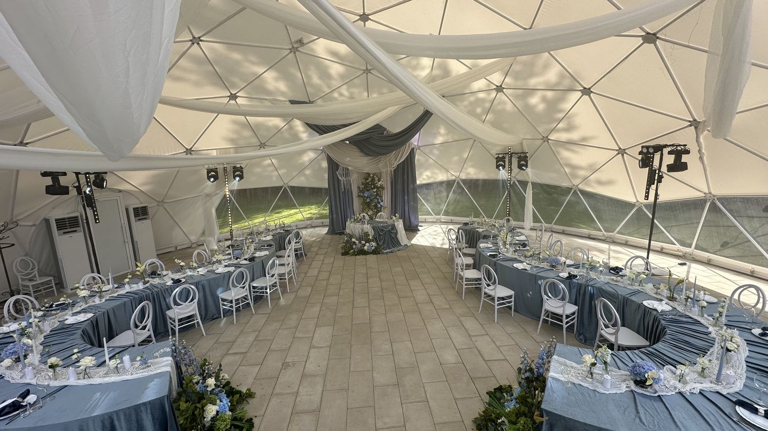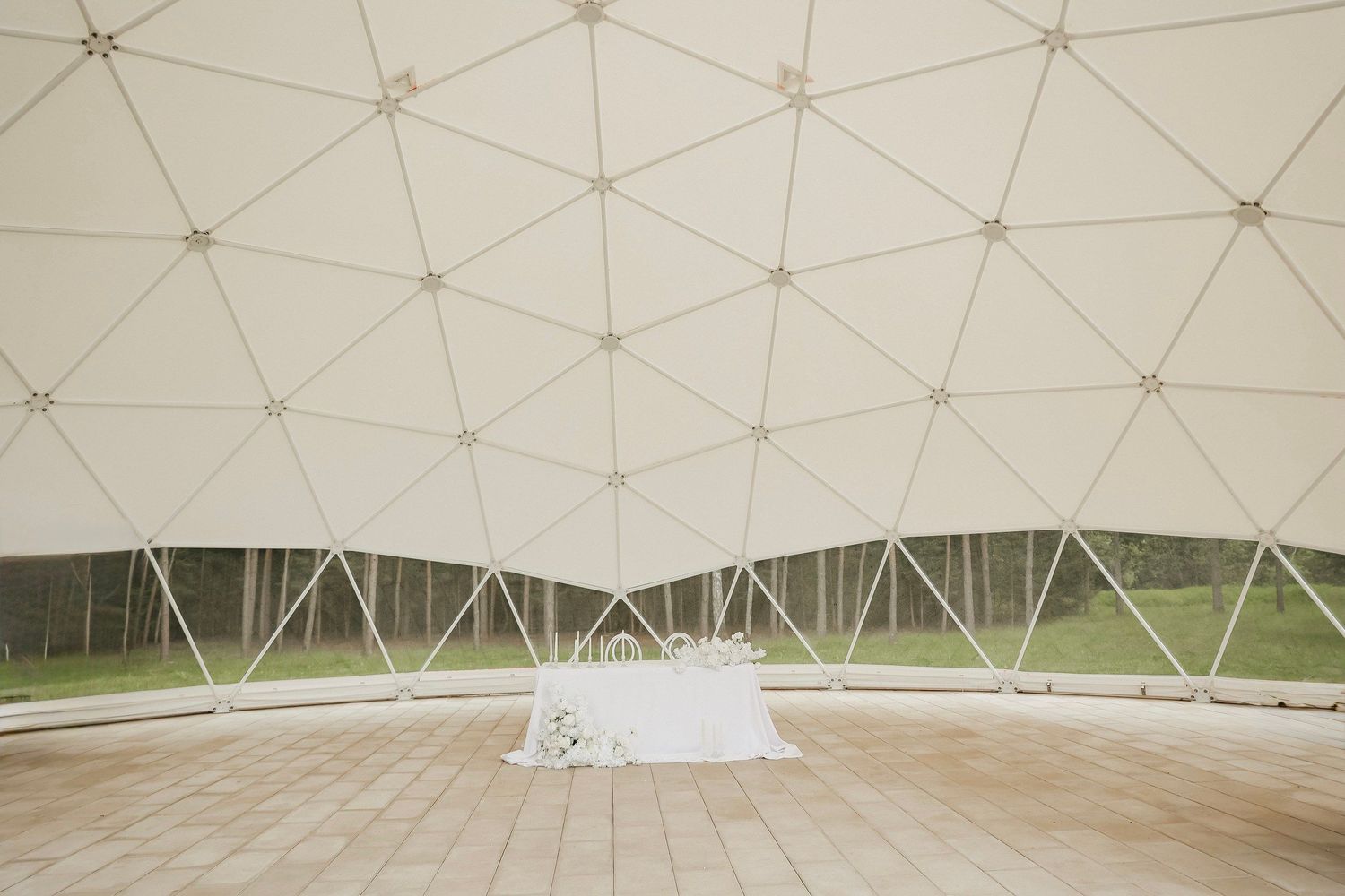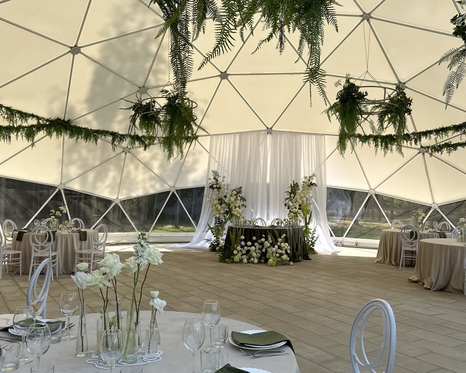 Банкетный зал для свадьбы расположен за городом, на свежем воздухе. «Сфера» - это дизайнерский просторный зал с крышей в форме купола сферы, площадь которого составляет 250 кв.м.