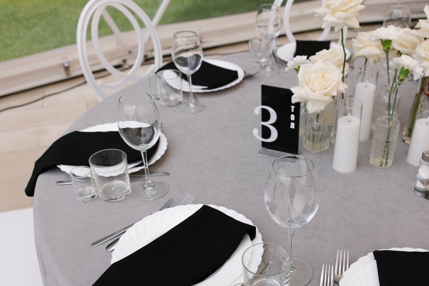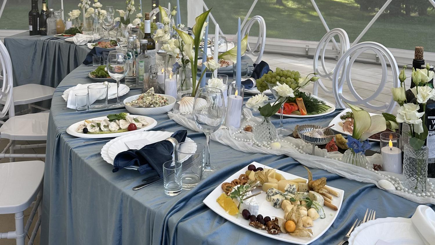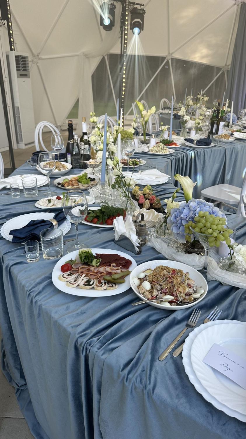 На стол подаются канапе и холодные закуски – брускетты с разными начинками, сырное ассорти, ролл Филадельфия и оригинальная мясная композиция. Два сета из салатов, запеченные мини-эклеры, жульены разных видов, мини-шашлыки и киши.